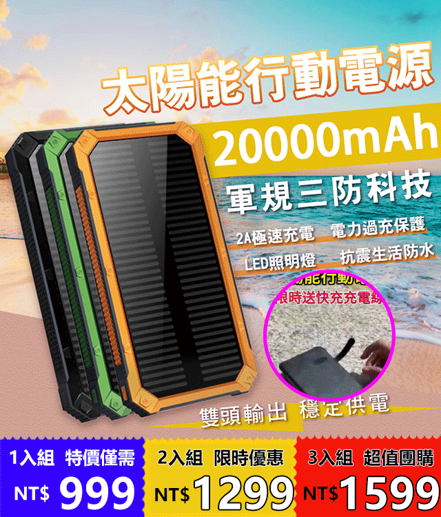 5分鐘前太陽能行動電源 - 【團購優惠】太陽能行動電源3入組僅需-NT$ 1599